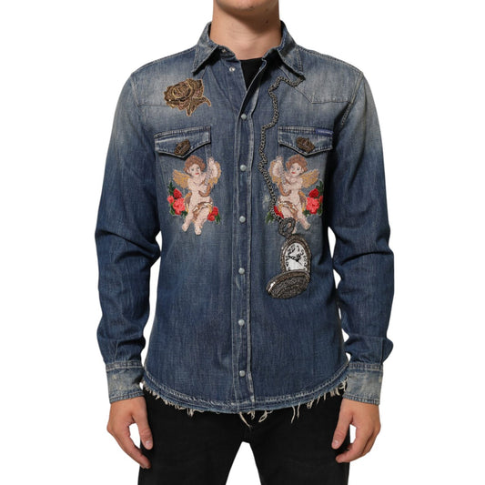 Dolce & Gabbana Blue Angel Patch Denim Buttoned Down Men Shirt